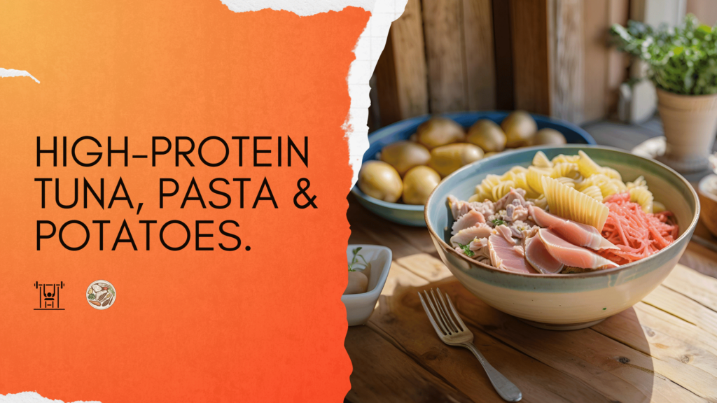 So, say hello to our tuna + potatoes and pasta dish served with fresh or frozen veggies. 74g of Protein & 640 calories.
